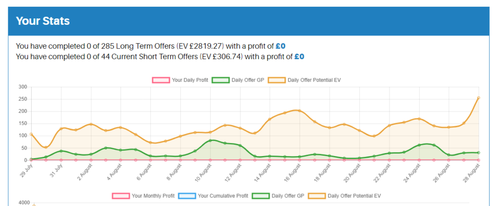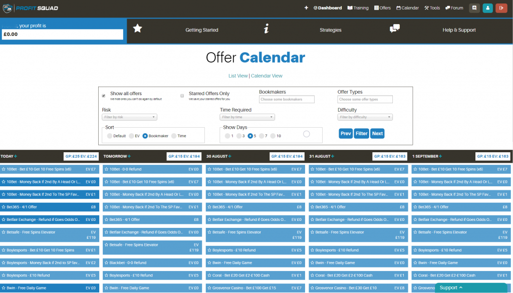 The calendar is where Profit Squad lists their daily reload offers for existing customers. Having the offers listed as a calendar helps users work their way through the offers for the day and keeps things organized. At the top of the list of offers for each day Profit Squad list the total +EV and guaranteed profit should you complete all of the offers? Again, this is a nice touch as it gives users a clear understanding of how much they can profit each day.