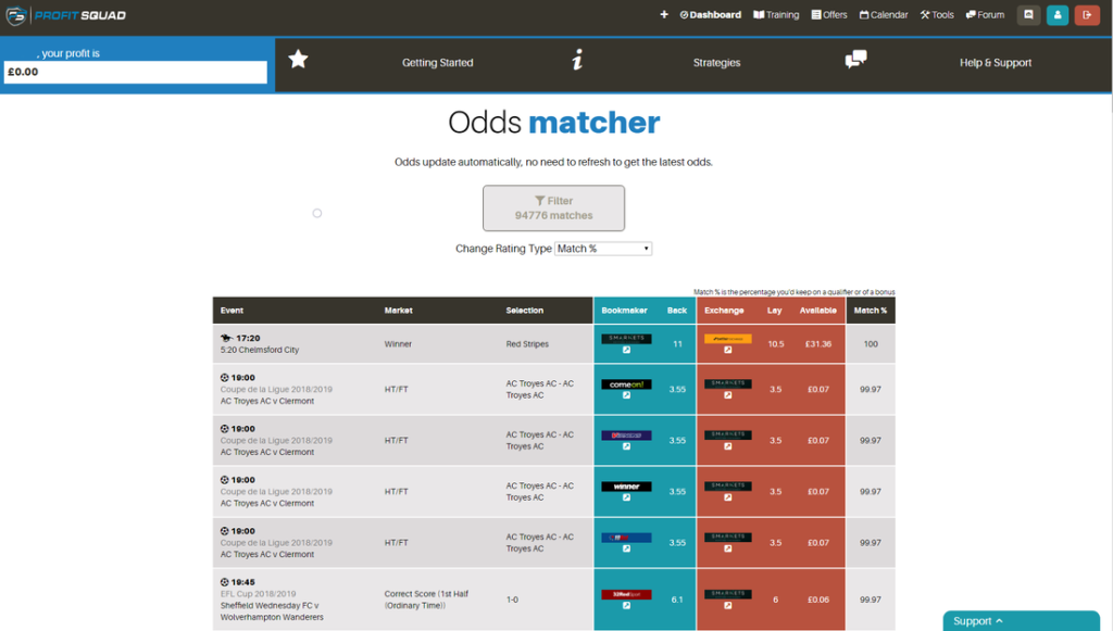 Since the merger with MatchedBets.com, the Profit Squad odds matcher has been improved and now auto-updated. This means that when the odds change on the bookmaker or betting exchange, they’ll update automatically in the odds matcher along with the rating. This is a very useful feature, especially when trying to find a match on an event that is close to starting and the odds are fluctuating quickly. It saves users a lot of time and a feature we’d like to see on more matched betting sites.